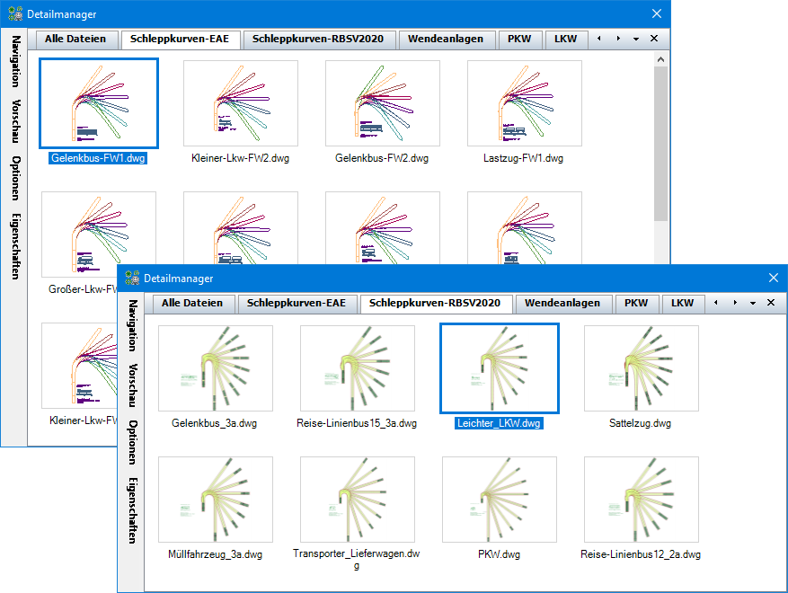 Die umfangreiche Symbolbibliothek von WS LANDCAD enthält diverse EAE-konforme Symbole in separaten Verzeichnissen. Diese Funktion ermöglicht in der werksmäßigen Voreinstellung einen direkten Aufruf der Schleppkurvenschablonen nach EAE sowie nach der RBSV 2020. Die Schablonen sind nach den jeweiligen Fahrzeugtypen benannt. Bei den Schablonen der RBSV 2020 sind die Spuren unterschiedlicher Winkelwerte aus separaten Layern, so dass diese ganz nach Bedarf ein- und ausgeschaltet werden können.