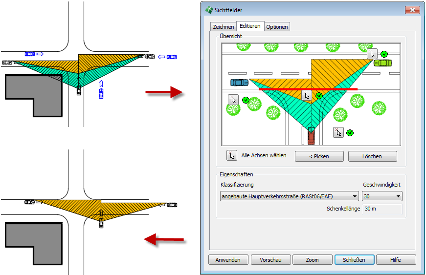 Durch Betätigung der Schaltfläche Anwenden werden die Sichtfelder den Optionen und den geänderten Bedingungen entsprechend neu gezeichnet.
