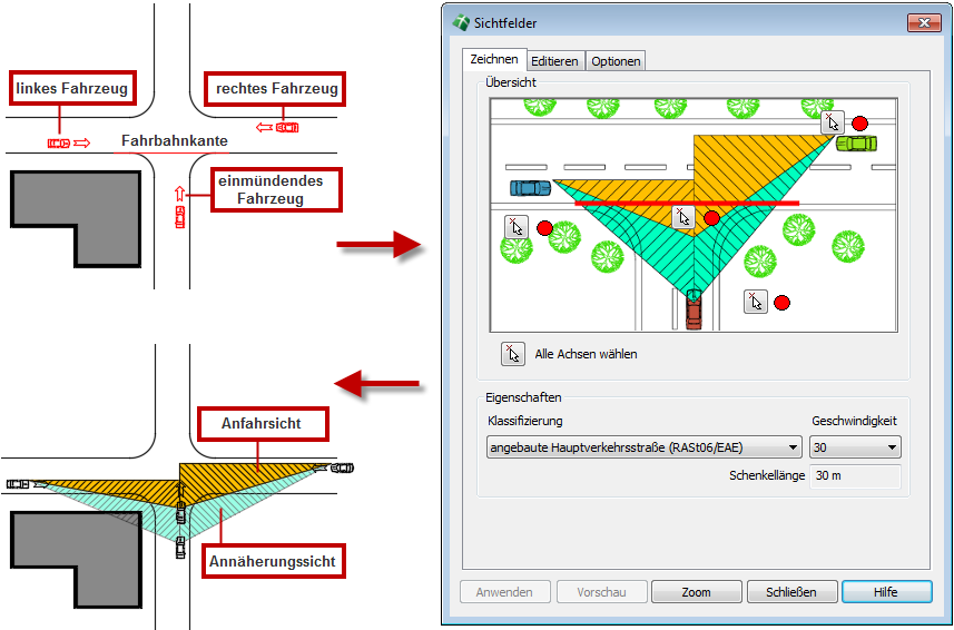 - Durch Betätigung der Schaltfläche Anwenden werden die Sichtfelder den Optionen entsprechend gezeichnet.