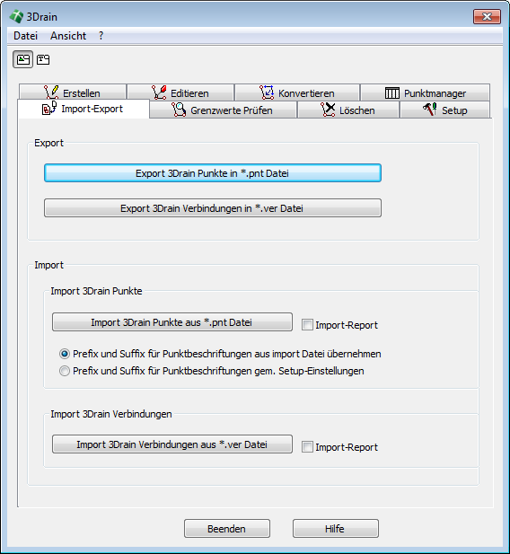 Mit dieser Funktion können Sie die in Ihrem Projekt vorhandenen Punkte und Verbindungen in eine ASCII-Datei exportieren oder ASCII-Dateien in Ihr Projekt integrieren.
