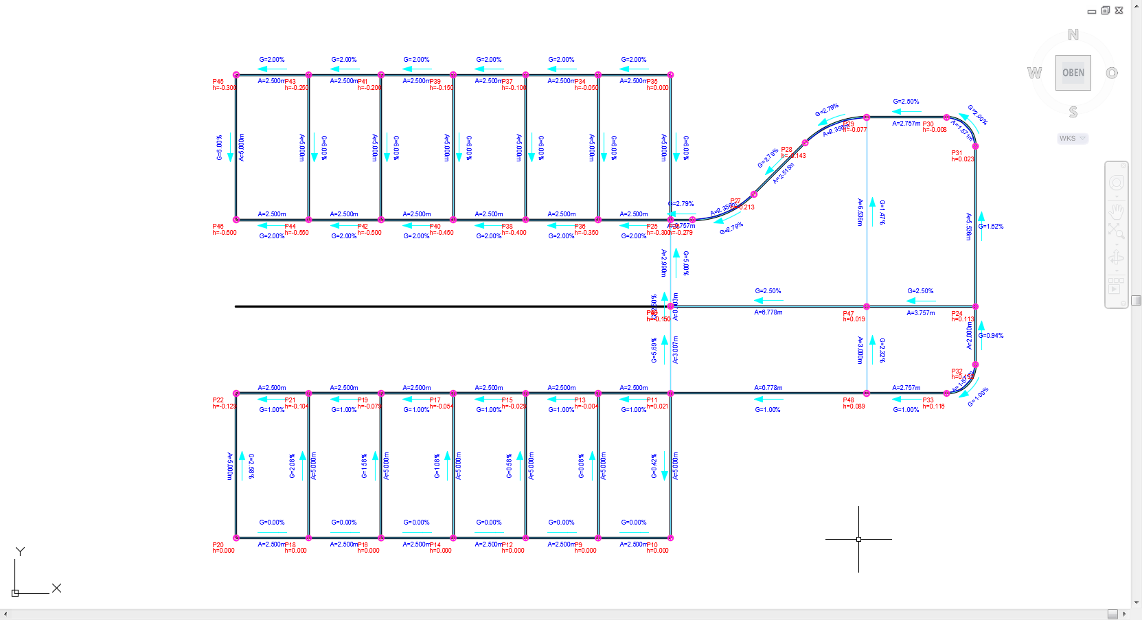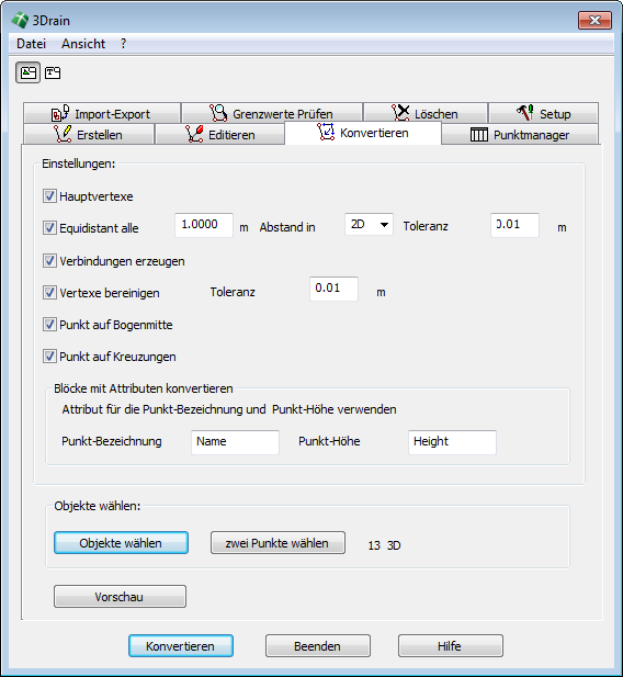 Die Konvertier-Funktion in 3Drain konvertiert vorhandene AutoCAD Objekte in 3Drain-Objekte. Die ursprünglichen Objekte werden hierbei nicht gelöscht und auch nicht verändert. Es wird an jede Stützstelle (Vertex – werden in AutoCAD als blaue oder rote Griffe dargestellt) der gewählten AutoCAD-Objekte ein 3Drain-Punkt gesetzt und durch Geraden oder Bögen miteinander verbunden. Diese Funktion soll das nachträgliche Setzen von Punkten auf die Planungsgeometrie beschleunigen und ersetzen.