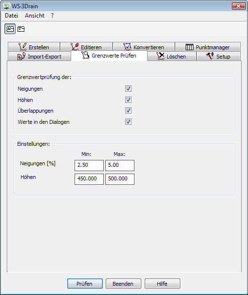 Im oberen Bereich der Dialogbox können Sie einstellen, was überprüft werden soll. Sie können hier gleichzeitig die Neigungen, die Höhen und die Überlappungen überprüfen. |