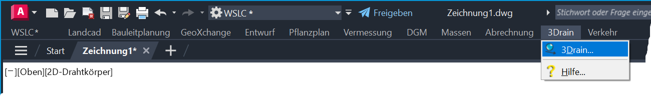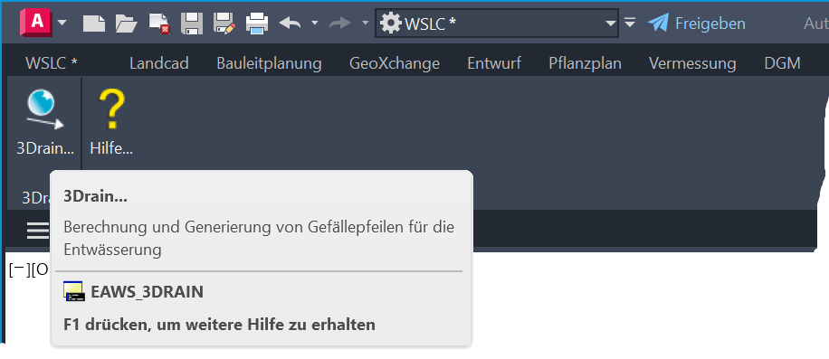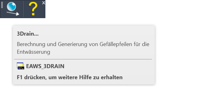 Zur Befehlsauswahl stehen je nach verwendetem CAD-System und verwendeter Konfiguration ein Register in der Multifunktionsleiste, ein Pull-down-Menü und ein Werkzeugkasten zur Verfügung, welche jeweils die gleiche Befehlsstruktur aufweisen. In diesem Modul steht lediglich der Befehl 3Drain (EAWS_3DRAIN) zur Verfügung, welcher den Hauptdialog mit der gesamten Funktionalität beinhaltet.