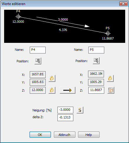 Hier können Sie jetzt auch die Neigung und die Höhendifferenz zwischen den beiden Punkten editieren. Um eine Neigung oder einen delta-Z-Wert editieren zu können, muss das Schloss-Symbol der Z-Koordinate geöffnet werden. Alternativ können Sie auch auf den Richtungspfeil-Button klicken. Mit jedem Klick wird die Richtung geändert. Das Vorschaubild zeigt die Punkte in der Ansicht (im Schnitt)! |