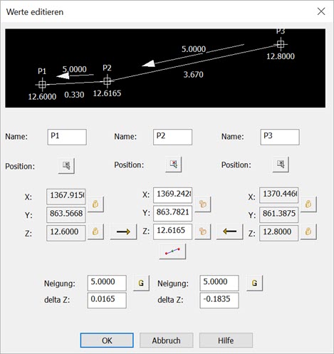 Soll z. B. die Neigung zwischen Punkt 1 und Punkt 2 und auch zwischen Punkt 2 und Punkt 3 genau 5% betragen, können Sie die Werte - wie im Bild dargestellt - fixieren und die gewünschten Neigungen 5% eingeben.