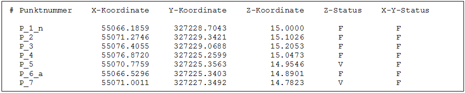 Beim Exportieren der Punkte in eine ASCII-Datei werden auch die jeweiligen Koordinaten-Stati für die Z -und die XY-Koordinate mit ausgegeben. Dies hat zum einen informativen Charakter, zum anderen wird beim Importieren der Punkte in eine neue Zeichnung der gültige Status mit übertragen. Hierbei steht F für Fixiert und V für Variabel.