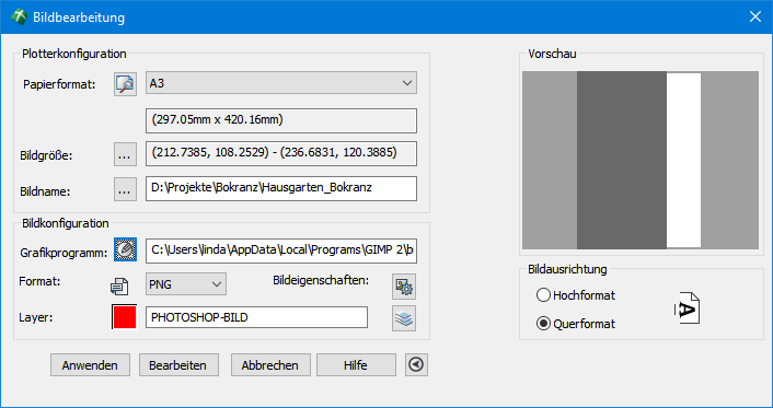 Mit dem Programm Bildbearbeitung wird eine Brücke zwischen den Genauigkeitsanforderungen eines CAD-Programms und der darstellungstechnischen Vielfalt eines leistungsfähigen Grafikpaketes geschlagen. Die bidirektionale Photoshop-Schnittstelle überträgt auf Knopfdruck einen gewählten CAD-Inhalt Layerweise in ein Grafikprogramm, in welchem das Abbild vielfältig manipuliert werden kann. Komplexe Farbverläufe, Schattierungen, photorealistische Füllmuster und Texteffekte können ohne Beschränkung beliebig angewendet und automatisch georeferenziert in die CAD-Zeichnung übertragen werden. Dadurch ist es möglich, alle Grafikaspekte eines externen Grafikeditors auch für eine CAD-Zeichnung anzuwenden. Die Bildbearbeitung unterstützt hierbei sämtliche Grafikprogramme, die in der Lage sind, das Photoshop-PSD-Format (*.psd) zu lesen und zu schreiben.