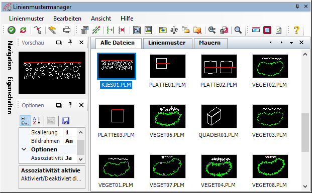 Der Linienmustermanager dient der Generierung, Verwaltung und Anwendung von Linienmustern. Unter einem Linienmuster versteht man einen Satz von Zeichnungselementen, welche bei der Anwendung auf bestehende Linien/Polylinien als gesamtes Muster entlang der Anwendungslinie generiert werden.