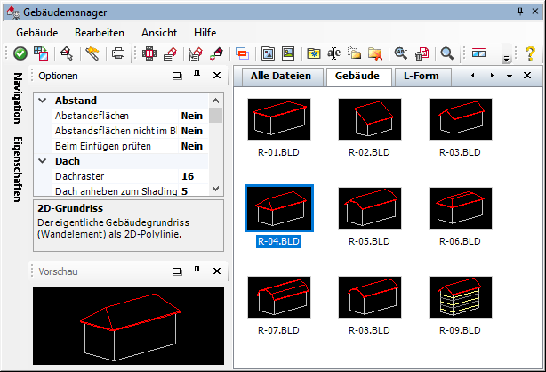 Der Gebäudemanager dient der Generierung, Verwaltung und Anwendung dreidimensionaler, parametrischer Gebäudekörper, welche für die Visualisierung und als Planungshilfe in der Stadt- und Objektplanung verwendet werden. Durch die Verwendung des WS LANDCAD-Managerprinzips können beliebig viele Gebäudetypen erstellt und in Verzeichnissen abgelegt werden, welche nach Anwendungsbereichen geordnet sind. Es ist ebenfalls möglich, beliebige Varianten von bestehenden Gebäuden zu erzeugen, diese in der Zeichnung anzuwenden und bei Bedarf wiederum separat, also als neue Gebäude, zu speichern. Die Gebäudekörper werden in den Verzeichnissen nicht als Zeichnungsblöcke, sondern als parametrische Textdateien (*.BLD) abgelegt und erst beim Einfügen in die Zeichnung aus diesen als Block generiert. Die Parameter umfassen alle wichtigen Gebäudedaten, wie z. B. Gebäudegrundform, Dachform, Länge, Breite etc., welche jeweils in einer Dialogbox dargestellt werden. Die Gebäudedaten können in der Dialogbox bequem eingegeben und auch aus der Zeichnung abgegriffen werden.