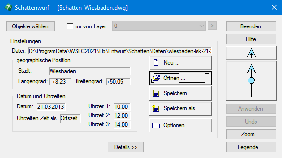 Das Dialogfenster zeigt die Einstellungen des Schattenwurfes an und gibt Ihnen die Möglichkeit, eigene Konfigurationsdateien zu erstellen. Die vorgenommenen Einstellungen werden in einer Parameterdatei mit der Endung *.SHD gespeichert. Das Vorgabeverzeichnis ist hierbei das Bibliotheksverzeichnis \ENTWURD\SCHATTEN\DATEN, sie können jedoch, entsprechend dem offenen System von WS LANDCAD, Parameterdateien in jedem beliebigen Verzeichnis anlegen. Hierbei kann mit dem Schalter Neu direkt eine neue Datei erstellt werden, mit Öffnen wird eine vorhandene Datei geöffnet, mit Speichern wird in die geöffnete bzw. neu erstellte Datei zurückgespeichert, und mit Speichern als kann eine bereits erstellte und geänderte Datei unter neuem Namen abgespeichert werden.