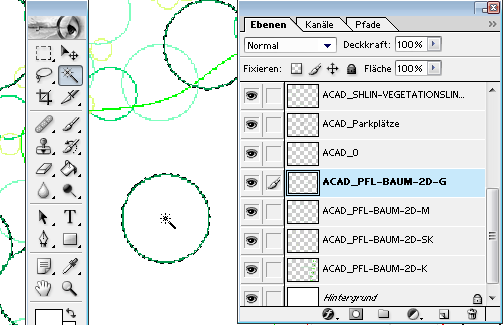 Im nebenstehenden Beispiel wird in der Layerliste zunächst der Layer mit der Baumsignatur ausgewählt. Alle Operationen beziehen sich daher nun ausschließlich auf diesen Layer. Mit dem Zauberstab wird nun in die Baumfläche geklickt, worauf der Baum in die Auswahl übernommen wird. Dazu ist es notwendig, dass die Pixel wirklich geschlossen sind. Falls mehr als die Baumfläche ausgewählt wird, gibt es irgendwo eine Lücke, die es gilt aufzuspüren und zu überzeichnen. Die Auswahl lässt sich bei Photoshop mit gedrückter Shift-Taste erweitern. |