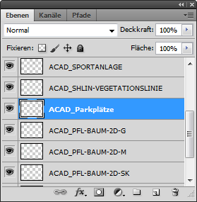 Hierbei werden zunächst alle sichtbaren Layer in Dateien geplottet, aus welchen dann eine PSD-Quelldatei erzeugt wird. Anschließend wird das Grafikprogramm mit dieser PSD-Datei geöffnet. Das CAD-Programm wird dabei i. d. R. in den Hintergrund geschaltet und ist so lange deaktiviert, bis sie das Grafikprogramm wieder beenden. Die PSD-Datei enthält alle zuvor sichtbaren CAD-Layer als transparente Grafiklayer. Sie sind daran zu erkennen, dass ihnen das Präfix ACAD_ vorangestellt ist. |