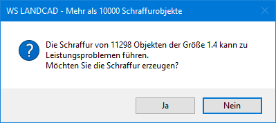 Bei Block- und Bildschraffuren wird die Anzahl der benötigten Kacheln direkt nach der Objektwahl ermittelt. Übersteigt deren Zahl einen Wert von 10000, dann erscheint ein Hinweis zur benötigten Anzahl bei der verwendeten Skalierung. Sie können nun entscheiden, ob Sie die Schraffur lieber abbrechen wollen. |