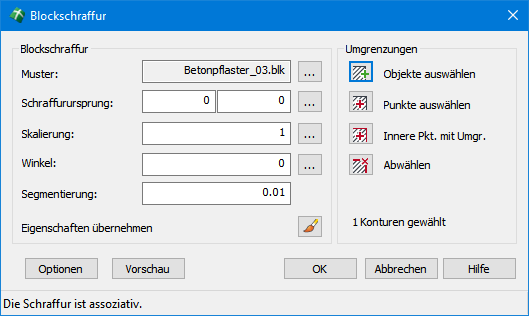Durch die Veränderung der Eigenschaften werden die aktuellen Optionen nicht verändert, da diese für jede Anwendung gelten. Die Schraffur wird erst dann endgültig erzeugt, wenn der Dialog mit OK beendet wird. Jede Blockschraffur besteht aus einer Gruppe und ist assoziativ. |