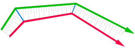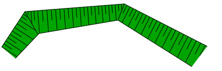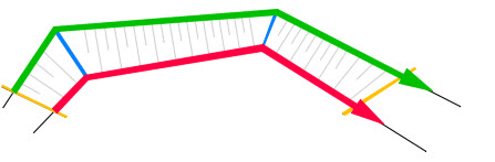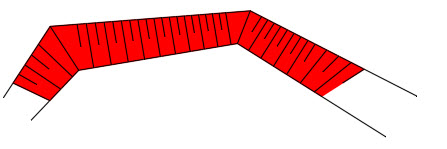 Im folgenden Beispiel eines Einschnitts werden die Anfangslinien entfernt aber die Kehlen beibehalten. Die Böschungsart wird in Damm geändert, wodurch sich auch die Hintergrundfüllung ändert. Die Kehlen bewirken nun eine Verschneidung der Schraffen mit den Kehllinien.
