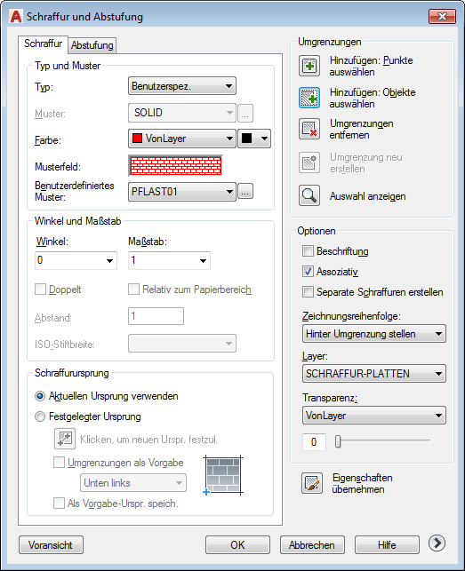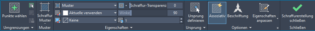 Bitte beachten Sie, dass stets die Optionswerte des Schraffurmanagers übertragen werden. Wenn z. B. die Skalierung oder der Drehwinkel anders sein sollen, können Sie dies während der Anwendung ändern, solange Sie den Befehl nicht abschließen.