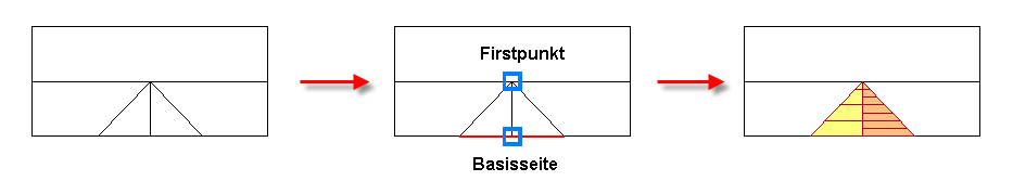 Auch Dachgauben lassen sich einfach erzeugen - ähnlich wie bei den Dreiecksflächen definiert eine Basislinie und ein weiterer Punkt (meist der Firstpunkt der Gaube) eine Giebelfläche. Die Firstlinie des Giebels beginnt hierbei mittig in der Basislinie und verläuft dann zum dritten Punkt. Über die Option Sonnenrichtung immer abfragen kann auch hier die Sonnen-/Schattenzuordnung umgekehrt werden.