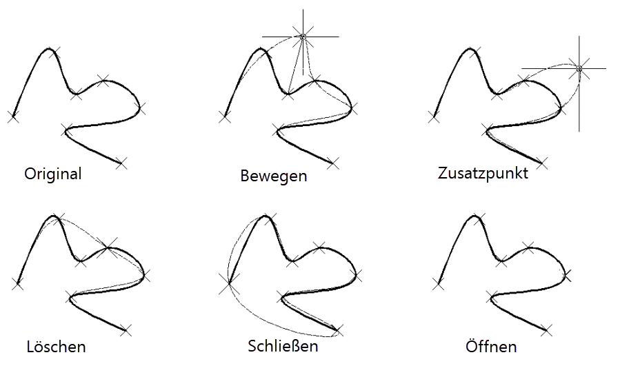 - Löschen: Diese Option löscht den aktuellen Stützpunkt. Die Kurve verläuft nun automatisch durch die verbleibenden Stützpunkte.