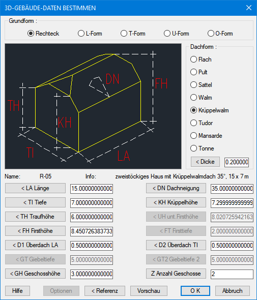 In der Dialogbox wird zunächst die Grundform des Gebäudes und dessen Dachform bestimmt. Hierzu wird je nach Kombination der Parameter eine entsprechende 3D-Grafik eingeblendet, welche die jeweils weiter zur Verfügung stehenden Gebäudeparameter anzeigt. Im darunter befindlichen Teil können Sie die sich gegenseitig bedingenden Parameterwerte bestimmen. Diese können direkt in die Eingabefelder eingetragen oder aus der Zeichnung abgegriffen werden, indem die daneben befindlichen Schaltflächen betätigt werden. Die Dialogbox klappt dabei weg, und Sie werden aufgefordert, jeweils 2 Punkte in der Zeichnung zu zeigen. Gerade bei der Visualisierung einer bestehenden 2D-Zeichnung ist dies die bevorzugte Arbeitsmethode. Zwischen den einzelnen Parametern bestehen mathematische Beziehungen, die beim Ändern eines Wertes nachgeführt werden. Die Nachführung wird durch Betätigung der Return-Taste gestartet, nachdem ein Wert verändert wurde.