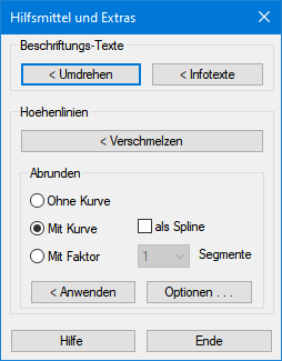 Diese Funktion bietet diverse Hilfsmittel zur Bearbeitung von Höhenlinien und weitere Tools, welche im Umfeld topografischer Bearbeitungen oft benötigt werden. Hierzu zählen das Umdrehen von Beschriftungstexten, die Erzeugung von topografischen Infotexten, das Verschmelzen von Höhenlinien sowie die Abrundung von Höhenlinien nach diversen Möglichkeiten. |