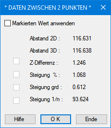 Mit dem Button <Info können zwei beliebige Raumpunkte abgefragt werden, deren Daten bei der Bearbeitung der angezeigten Polylinie behilflich sind. Nachdem Sie 2 Punkte in der Zeichnung (z. B. auch mit Objektfang) gepickt haben, werden folgende Daten angezeigt: Abstand 2D und 3D, Z-Differenz, Steigung (%, grd, 1/n). Wenn Sie das Kontroll-Kästchen Markierten Wert Anwenden setzen, werden die markierten Datenwerte auch direkt in die Editierfelder für Höhe und Steigung übernommen. |