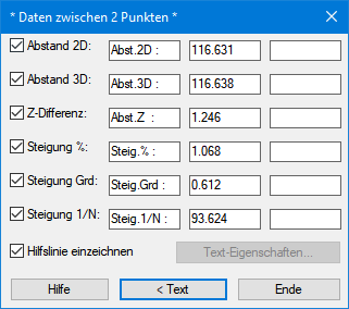 Nachdem Sie 2 Punkte in der Zeichnung gepickt haben, öffnet sich ein Dialog, in welchem alle relevanten Messwerte zwischen diesen Punkten angezeigt sind. Zusätzlich können Sie mit dem jeweiligen Schalter bestimmen, ob der zugehörige Text in die Zeichnung übernommen werden soll. Außerdem kann der ermittelte Wert direkt editiert werden, z. B. um den Wert um vorangestellte oder nachgestellte Texte zu erweitern. Die Text-Parameter dieser Beschriftungstexte können mit dem Button Text-Eigenschaften eingestellt werden. Ist zusätzlich der Schalter Hilfslinien einzeichnen gesetzt, werden die 2 gepickten Punkte und die Infotexte durch eine Hilfslinie verbunden. |