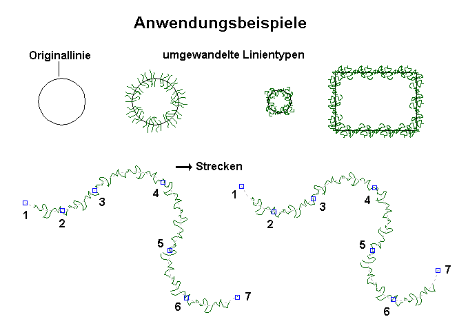 Die neuen Linientypen haben genauso viele Stützpunkte wie die umgewandelte Originallinie. Sie können diese Stützpunkte an den Griffen anfassen und beliebig verändern. Die Grafik wird stets allen Änderungen sofort folgen. Sie können den Richtungssinn jederzeit auch mit der Standard-WS LANDCAD-Funktion ändern. Den Skalierungsfaktor (Linientypfaktor) können Sie einfach verändern, indem Sie den Eigenschaften-Dialog aus dem Kontextmenü aufrufen, während eine Linie ausgewählt ist.