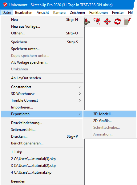 Die SketchUp-Schnittstelle beinhaltet neben dem i. d. R. automatisch ausgeführten Datenaustausch auch die Möglichkeit, die Zeichnungsdaten auf halbautomatischen Weg auszutauschen. Diese Möglichkeit wurde für die Fälle vorgesehen, in denen die Automatik z. B. aufgrund einer gestörten Schnittstellen-Kommunikation nicht erfolgreich ist. Dazu ist das Modell in SketchUp über den Befehl Datei → Exportieren → 3D-Modell zunächst in eine DWG-Datei beliebigen Namens zu speichern. SketchUp kann danach verlassen werden. In WS LANDCAD ist anschließend die Schaltfläche Importieren zu betätigen, worauf ein Standard-Dateidialog erscheint, mit dem Sie die zuvor erstellte DWG auswählen können. |