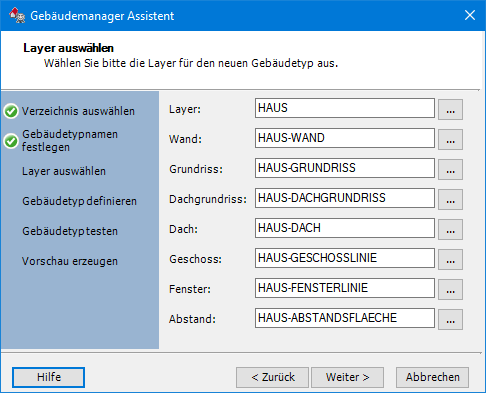 Im dritten Schritt können Sie das Gebäude mit Vorgabelayer verknüpfen. Über die Schaltfläche Layer auswählen gelangen Sie in die Layersteuerung von WS LANDCAD, mit deren Hilfe Sie den Layer spezifizieren können. Die in der Entwurfsbibliothek \Lib\Entwurf\Gebäude und den Unterordnern vorhandenen Gebäude sind bereits mit einem Layer HAUS verknüpft, während den Einzelbestandteilen der Gebäude stets das Präfix HAUS vorangestellt ist, z. B. HAUS-WAND. Die Layerverknüpfung können Sie nachträglich jederzeit im Eigenschaften- bzw. im Optionsfenster des Managers erstellen oder editiert. |