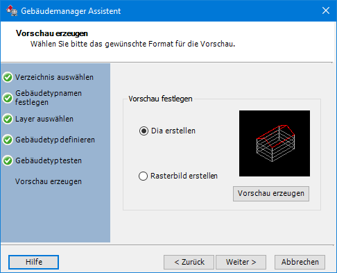 Im sechsten Schritt wird das Gebäude erstellt und je nach Optionswahl ein Dia oder Rasterbild erzeugt. Nach Betätigung der Schaltfläche Vorschau erzeugen erscheint zunächst eine kleine Zoom-Dialogbox mit deren Hilfe sie einen günstigen Ausschnitt für das Bild herstellen können und die Sie anschließend mit OK bestätigen. Das Bild erscheint daraufhin im Diamenü des Schraffurmanagers. Mit Hilfe des Befehls Dia Update aus dem Pull-down-Menü Bearbeiten können Sie das Dia jederzeit aktualisieren. Hierbei erscheint abermals der Zoom-Dialog, welcher mit OK zu bestätigen ist. |