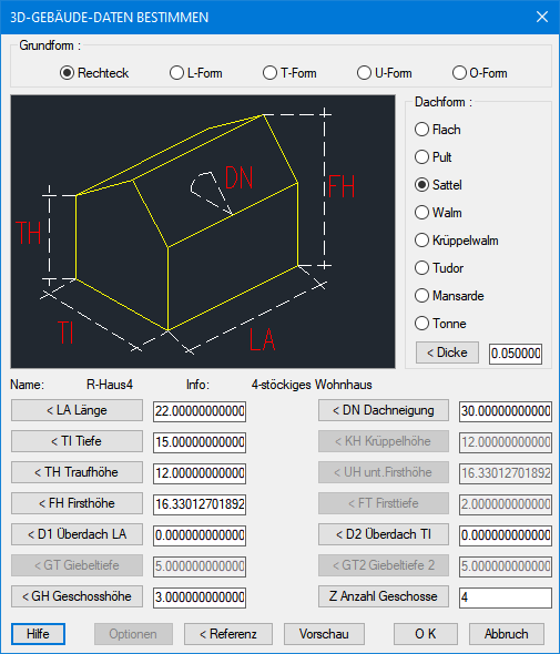 Hier können Sie alle Parameter wie gewünscht einstellen. Legen Sie als erstes die Grundform und die Dachform des Gebäudes fest. Im unteren Teil geben Sie alle erforderlichen Parameter entweder direkt ein oder greifen den Wert über die entsprechende Schaltfläche in der Zeichnung ab. Genaueres hierzu entnehmen Sie bitte dem Kapitel Eigenschaften eines Gebäudes. Über Vorschau können Sie das Gebäude vorab in der Zeichnung testen. Hier können Sie auch den Bezugspunkt ggf. neu bestimmen. Verlassen Sie sowohl den Vorschau- als auch den Hauptdialog über OK. Die daraufhin erscheinende Anfrage beantworten Sie mit Ja.