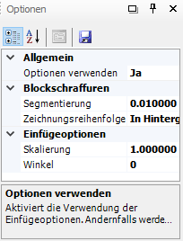 Die Optionen der Blockschraffur sind zusätzlich zum Optionsfenster des Schraffurmanagers auch über den Anwendungs- oder Editierdialog aufrufbar und beinhalten hier die Festlegung der Zeichnungsreihenfolge, da die übrigen Parameter bereits im Anwendungsdialog vorhanden sind. Änderungen der Optionen im Anwendungsdialog verändern nicht die Parameter in den generellen Optionen des Managers.