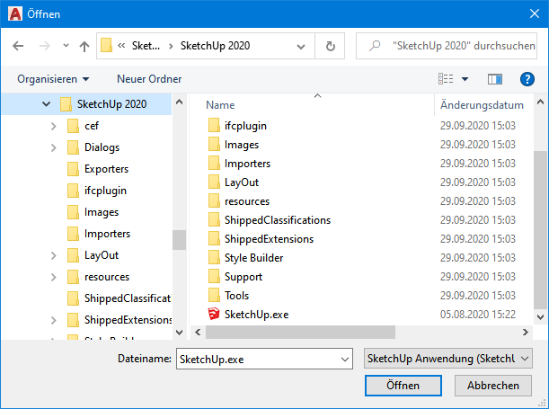 Der Pfad zur SketchUp.exe, dem ausführbaren SketchUp-Programm wird i. d. R. automatisch ermittelt. Sollte dies nicht der Fall sein oder wurde das Programmverzeichnis z. B. verschoben, lässt sich der SketchUp-Pfad jederzeit manuell angeben, indem der Dateidialog geöffnet und die Sketchup.exe gezeigt wird. Dieser Pfad ist auch für die erstmalige Einrichtung der SketchUp-seitigen Schnittstelle von Bedeutung, die als Provider bezeichnet wird. |