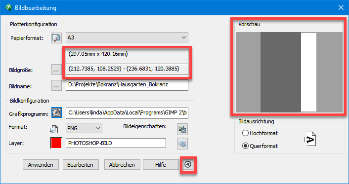 Durch Betätigung des Icons für das Papierformat erhalten sie auch eine generelle Vorschau auf das gewählte Format durch das verwendete CAD-Programm. Im Dialogbereich Bildausrichtung kann hierbei zwischen Hochformat und Querformat gewechselt werden. |