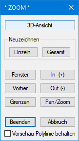 Mit dem Vorschau-Button erzeugen Sie die in der Daten-Liste dargestellte Polylinie auch real in der Zeichnung. Falls die aktuelle Polylinie von einem zuvor in der Zeichnung gewählten Element abstammt, wird dieses zum Vergleich mit ausgeleuchtet. Die Polylinie wird in der Vorschau stets gelb gezeichnet; es öffnet sich dann ein kleiner Zoom-Dialog, mit welchem Sie sich in der Vorschau bewegen können. Die Isometrische Ansicht kann ebenfalls aktiviert werden. Im Zoom-Dialog kann ein Schalter gesetzt werden, um die gezeichnete Polylinie zu behalten, was der Funktion Anwenden auf dem Hauptdialog entspricht. Wenn Sie den Zoom-Dialog mit Abbruch beenden, wird die anfangs vorhandene Ansicht wieder hergestellt; bei Beenden bleibt die aktuelle Ansicht auch weiterhin in der Zeichnung bestehen. |