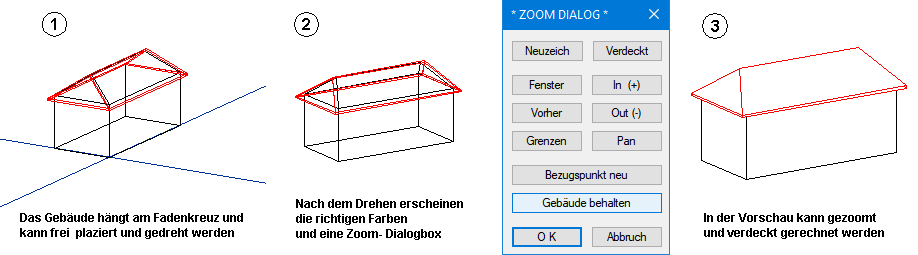 Nachdem Sie ein Gebäude ausgewählt und die Vorschau aktiviert haben, wird das Gebäude aus den Parameterdaten neu generiert und hängt anschließend mit einem Bezugspunkt (i. d. R. eine Gebäudeecke) am Fadenkreuz. Sie können das Gebäude nun frei platzieren und anschließend um den Bezugspunkt drehen. Das Gebäude erscheint nun in den entsprechenden Eigenschaften der Vorgabelayer. Gleichzeitig wird eine erweiterte Zoom-Dialogbox geöffnet, die es Ihnen erlaubt, sich an das Gebäude heran zu zoomen und auch den Verdeckt-Befehl zu aktivieren. Wenn Sie einen Eindruck vom Gebäude gewonnen haben, können Sie die Dialogbox und damit die Vorschau mit OK verlassen. Das für die Vorschau generierte Gebäude wird damit wieder aus der Zeichnung entfernt. Alternativ dazu können Sie das Gebäude durch Betätigung der Schaltfläche Gebäude behalten auch in der Zeichnung belassen.