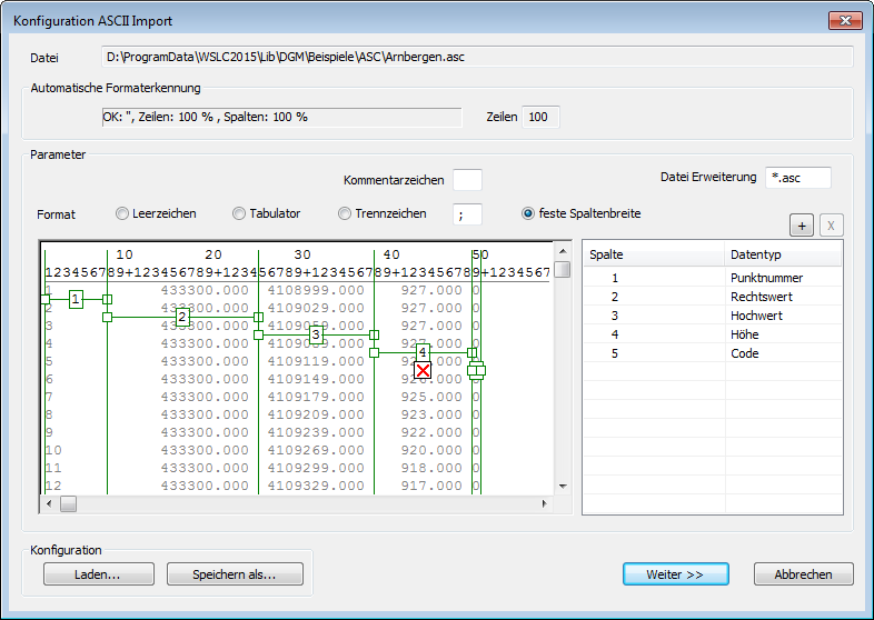Nach Auswahl einer oder mehrerer Dateien, welche das zu definierende Datenformat beinhalten, erfolgt eine automatische Analyse der Datenstruktur. Die Formaterkennung beruht auf statistischen Methoden. Das Ergebnis dieser Analyse wird im Feld automatische Formaterkennung angezeigt. Bei Bedarf kann das Ergebnis manuell verändert werden, indem die Parameter verändert werden. Ein Teil der Daten der (ersten) Ausgangsdatei wird dann im Vorschaufenster dargestellt sowie das Ergebnis der automatischen Formaterkennung. Im Regelfall sind dabei bereits die erforderlichen Spalten für die Punktnummer, den Rechtswert, den Hochwert, die Punkthöhe sowie den Punktcode automatisch zugewiesen. Die Werte für den Rechts- und Hochwert sowie die Punkthöhe sind Voraussetzungen für ein Oberflächenmodell.