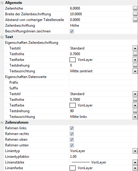 Für die Abstandswerte können die Eigenschaften für den Textstil, Texthöhe, Textfarbe, Textdrehung und die Textausrichtung, getrennt für den Zeilenkopf und die Datenwerte, definiert werden. Die Tabellenzeile selbst kann mit einem Rahmen umgrenzt werden, wofür die Eigenschaften der Rahmenelemente als Optionen definierbar sind.