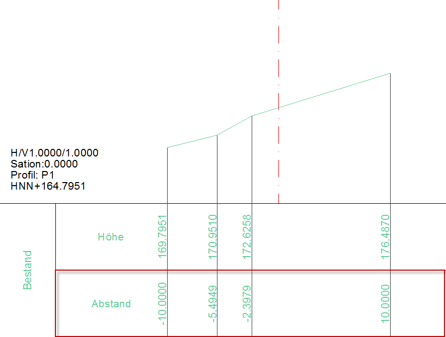 Die Abstandswerte der jeweiligen Geländepunkte von der Schnittachse aus sind als Beschriftung in einer Tabellenzeile darstellbar.