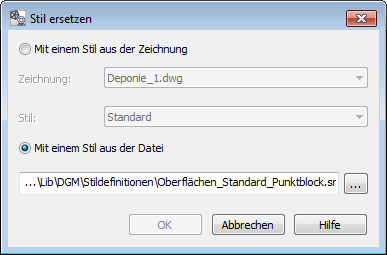 Diese Funktion ermöglicht es, den aktuellen Stil vollständig durch die Definitionen eines anderen Stils zu ersetzen. Der Name des ursprünglichen Stils bleibt hierbei erhalten. Der Dialog Stil ersetzen bietet dazu die Möglichkeiten, den Stil entweder aus einer geöffneten DGM-Zeichnung oder aus einer externen Stildefinition im Format *.srs zu wählen. Vorkonfigurierte Beispielstile finden Sie im Bibliotheksverzeichnis des DGMs. |