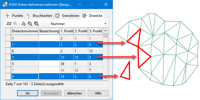 Hinweis: Die Darstellung der Dreiecksdaten spiegelt stets den aktuellen Zustand der Dreiecksvermaschung wider. Wenn sie bei geöffnetem Dateneditor z. B. Punkte ändern (rot) oder neu hinzufügen (grün), werden diese solange nicht in das TIN eingerechnet, bis Sie die Änderung mit OK oder Anwenden bestätigen.