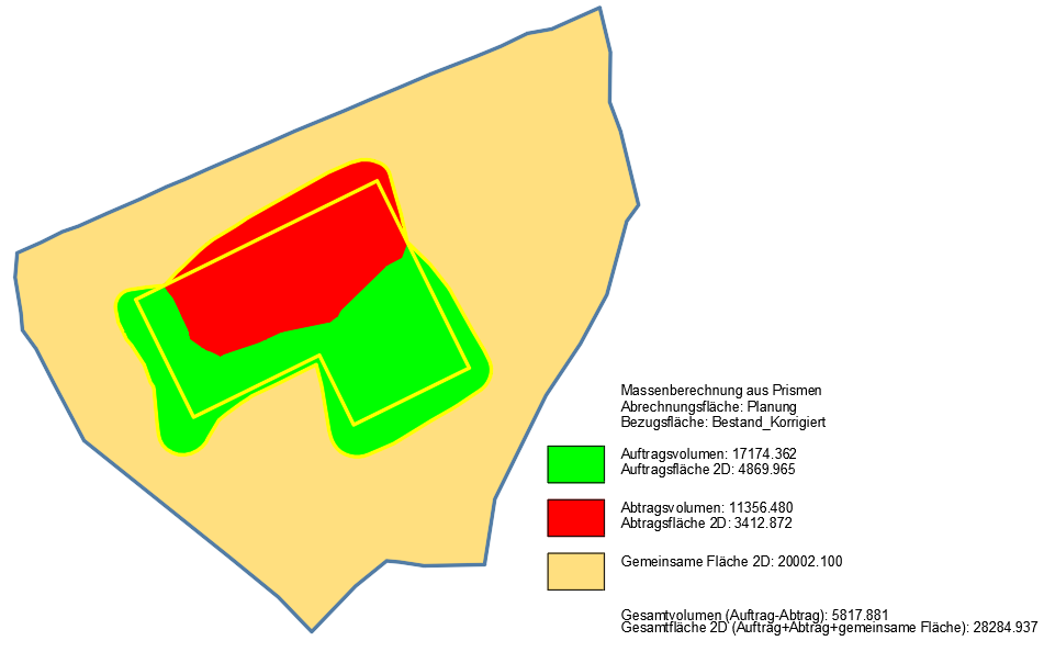 Der Auf- Abtragsplan wird dazu verwendet, das Ergebnis der Prismenberechnung im Grundriss darzustellen und hier insbesondere eine grafische Trennung der Auftrags- und Abtragsbereiche vorzunehmen. Zum Auf- Abtragsplan lässt sich optional eine Legende erstellen, welche das Berechnungsergebnis, wie im Ergebnisdialog dargestellt, und die zugeordnete Grafik dokumentiert.