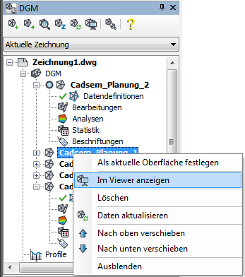 Bei der direkten Auswahl einer Oberfläche innerhalb des Projektbrowsers kann diese über die Funktion des Kontextmenüs in den DGM-Viewer überführt werden. Die jeweils ausgewählte Oberfläche wird direkt in den DGM-Viewer übertragen und dort angezeigt. Es muss sich hierbei nicht um das aktuelle DGM handeln. Für die Darstellung der Oberfläche gelten ebenfalls die Einstellungen innerhalb der Optionen des DGM-Viewers. |