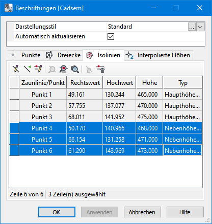 Mit dieser Darstellung haben Sie eine optische Kontrolle über die Auswahl der Liste und können ggf. Korrekturen der Auswahl vornehmen. Nach der Bestätigung mit OK oder Anwenden werden die Beschriftungen gelöscht und die Isolinien wieder geschlossen.