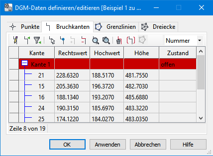 Verlässt den Editiermodus und kehrt in den Bruchkanteneditor zurück. Die editierte Bruchkante ist nun rot hinterlegt. Erst wenn die Bestätigung mit OK oder Anwenden erfolgt, wird die Bruchkante tatsächlich geändert und in das DGM eingerechnet. Durch Betätigung von Abbrechen werden alle zuvor erfolgten Schritte rückgängig gemacht. |