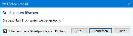 Dieser Befehl löscht eine oder mehrere ausgewählte Bruchkanten. Zur Auswahl können Sie diese zuvor auch mit dem Befehl Bruchkante wählen aus der Zeichnung selektieren. Vor dem Löschen erscheint stets eine Sicherheitsabfrage, um versehentliches Löschen zu verhindern. Zusätzlich besteht die Möglichkeit, übernommene Punkte auch zu löschen. Übernommene Punkte entstehen durch das Holen von Bruchkanten aus Zeichnungselementen, wobei übernommene Stützpunkte nicht identisch mit bereits vorhandenen DGM-Punkten sind.
