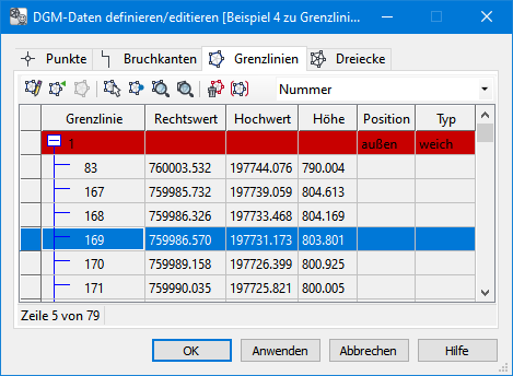 Verlässt den Editiermodus und kehrt in den Grenzlinien zurück. Die editierte Bruchkante ist nun rot hinterlegt. Erst wenn die Bestätigung mit OK oder Anwenden erfolgt, wird die Grenzlinie tatsächlich geändert und in das DGM eingerechnet. Durch Betätigung von Abbrechen werden alle zuvor erfolgten Schritte rückgängig gemacht. |