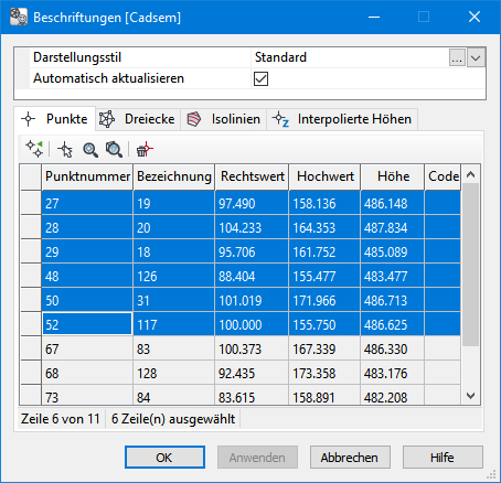 Mit der Funktion ausgewählte Punktbeschriftungen löschen werden in der Zeichnung vorhandene Beschriftungen der Punkte gelöscht. Die zu löschenden Punkte müssen vorher in der Liste ausgewählt werden. Zusätzlich werden die ausgewählten Punkte in der Zeichnung markiert angezeigt. Mit dieser Darstellung haben Sie eine optische Kontrolle über die Auswahl der Liste und können ggf. Korrekturen der Auswahl vornehmen. Die Auswahl ist natürlich auch möglich, wenn die Punkte zuvor mit der entsprechenden Funktion in der Zeichnung gewählt wurden. Die eigentliche Löschung erfolgt durch Betätigung der Schaltflächen OK oder Anwenden.