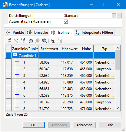 Mit der Funktion ausgewählte Zaunlinie löschen werden in der Zeichnung vorhandene Beschriftungen der Isolinien, die mit einer Zaunlinie erzeugt wurden, gelöscht. Die zu löschenden Zaunlinien müssen vorher in der Liste ausgewählt werden. Zusätzlich werden die ausgewählten Elemente in der Zeichnung markiert angezeigt. Mit dieser Darstellung haben Sie eine optische Kontrolle über die Auswahl der Liste und können ggf. Korrekturen der Auswahl vornehmen. Es können immer nur alle Beschriftungen einer Zaunlinie gelöscht werden. Nach der Bestätigung mit OK oder Anwenden werden die Beschriftungen gelöscht und die Isolinien wieder geschlossen. |
