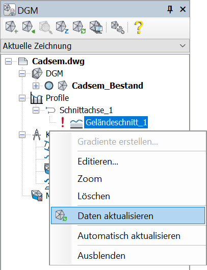 Jeder Geländeschnitt wird bei Änderungen von Referenzelementen automatisch aktualisiert. Diese Aktualisierung kann jederzeit deaktiviert bzw. aktiviert werden. Referenzelemente für den Geländeschnitt sind Oberflächen und die zugehörige Schnittachse. Die Kennzeichnung nicht mehr aktueller Geländeschnitte erfolgt durch ein rotes Ausrufungszeichen (!). Bei allen Geländeschnitten, deren Status auf manuelles aktualisieren gesetzt ist, wird zusätzlich die Funktion Daten aktualisieren im Kontextmenü angezeigt. Mit dieser Funktion können Sie die entsprechenden Geländeschnitte nun bei Bedarf aktualisieren. Alternativ besteht natürlich auch die Möglichkeit, wieder auf die automatische Aktualisierung zu wechseln. |